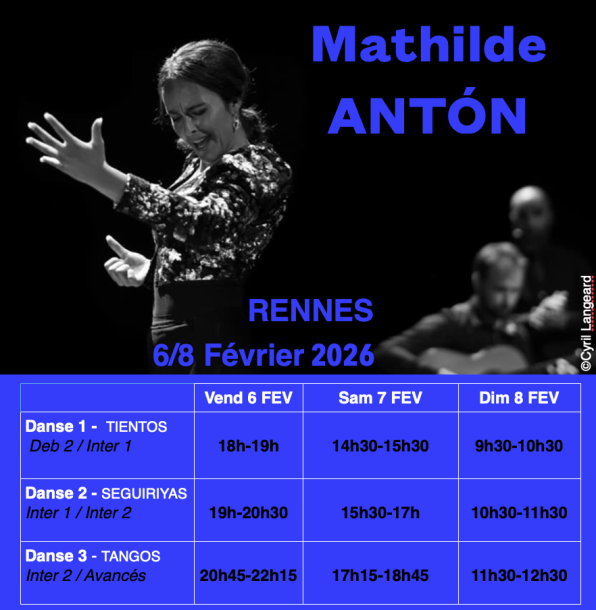 Originaire du Sud-Ouest de la France, Mathilde Antón s’est formée au flamenco à Séville. Artiste aujourd'hui incontournable de la scène flamenca française, elle vit à Barcelone et se produit en France et à l'étranger dans les tablaos les plus emblématiques partageant ainsi la scène avec des artistes tels que Chicuelo ou la Tana. La transmission tient une part importante dans son cheminement. Le dynamisme de ses cours, sa pédagogie et sa bienveillance font d'elle une professeur très appréciée.