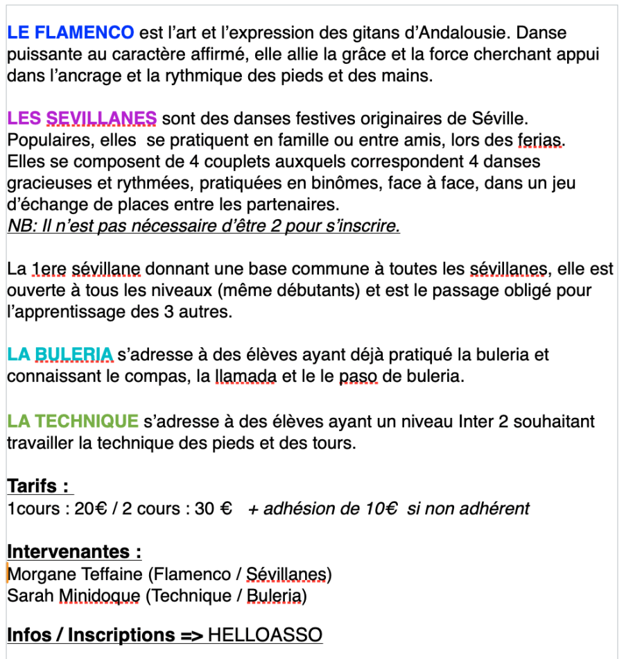 =>Contenu: s’initier aux basiques du Flamenco (technique des pieds, placement du corps, musicalité) sur un style des plus gitans: TANGOS