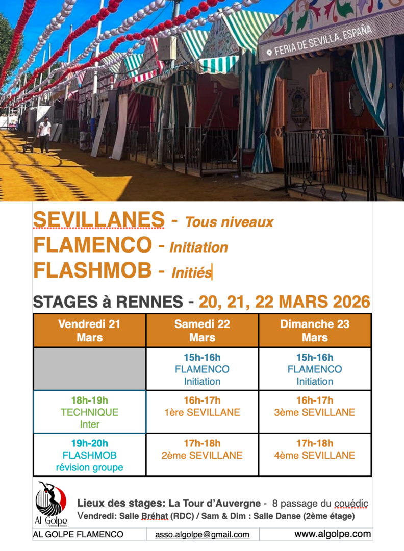 Tarifs : 50 euros / 45 euros* le stage de 4h30 + adhésion à l'ass. Al Golpe (10€)
